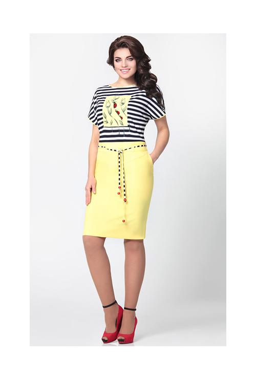 Платье женское полуприлегающего силуэта из двух видов ткани - вискозы и льна-вишера. Платье отрезное по талии. Верхняя часть платья - лиф цельнокроенный из вискозы. Вырез горловины круглый, обработан косой бейкой из отделочной ткани в цвет юбки. Низ платья - прямая юбка, чуть зауженная к низу с фигурными подрезами. По талии настрочены шлевки, через которые протянут тонкий пояс с декоративными наконечниками в виде бусин. С левой стороны платья в боковой шов вставлена потайная тесьма - молния. Рукав спущенный. Декор - по полочке лифа платья настрочен декоративный элемент (в виде прямоугольника), на котором выполнена вышивка. Длина платья - 93 см. Длина рукава - 15 см.